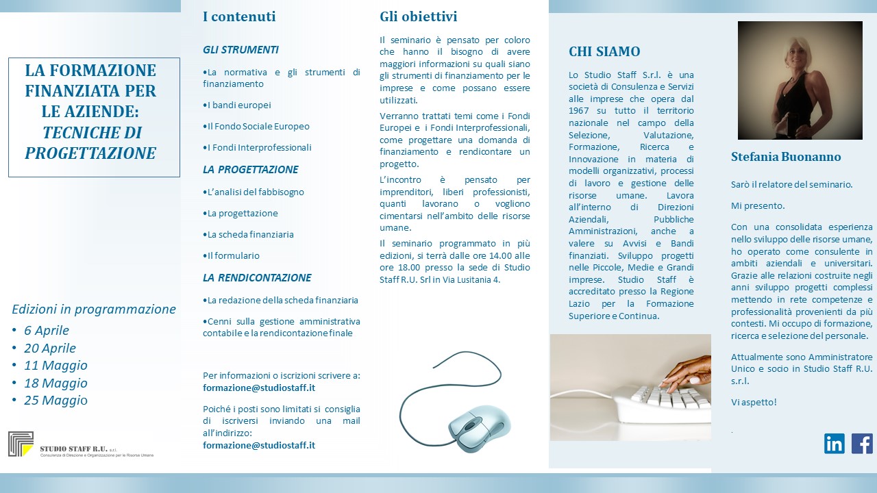 Studio Staff è un’azienda che ha sempre posto al centro la persona valorizzando un rapporto basato sulla capacità di ascolto e soprattutto mettendo a disposizione professionalità e competenze, senza ingessature derivanti da ruoli o processi farraginosi. Proprio per questo ho deciso di proporre io stessa un seminario gratuito ed estremamente pratico sui temi dei finanziamenti europei e sui fondi interprofessionali. Nella locandina allegata troverete maggiori informazioni, , vi consiglio quindi di iscrivervi scrivendo aformazione@studiostaff.it oppure contattandomi direttamente. Vi aspetto!